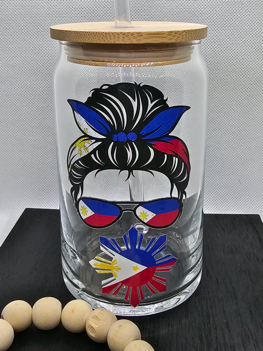 Philippine girl Libbey Glass Can 16oz with Bamboo lid and Straw