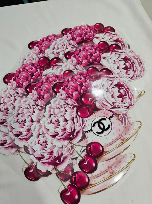 Tea Cup Cherry Flowers DTF Transfer 8 x 9 Inches